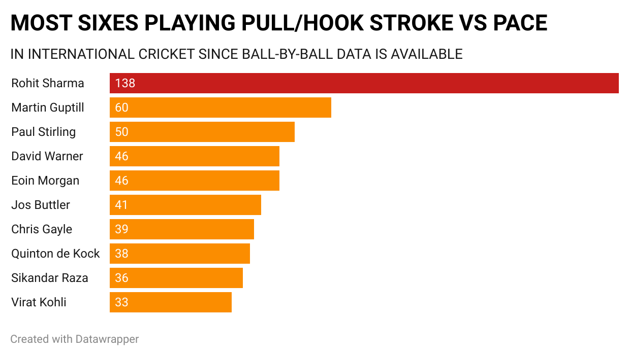 The 36-year-old has a strong affinity for the deliveries pitched short. Since the ball-by-ball data is available, covering 333 of Rohit’s 348 sixes against pace in international cricket, 49.5% of his maximums are struck on the back-of-a-length or short ball region.