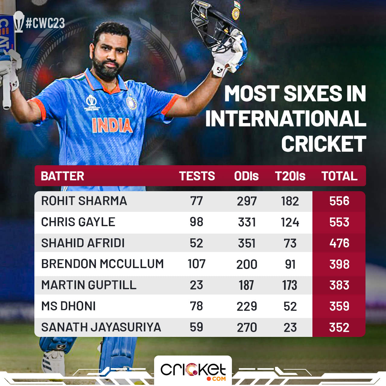 Rohit has the most sixes in T20Is (182). He has the third most in ODIs (297) and is behind Gayle (331) and Afridi (351). He is 23 sixes short of becoming the first Indian batter to become first Indian to hit 100 Test sixes. If form and fitness persist, he will have more of these records in his trove.