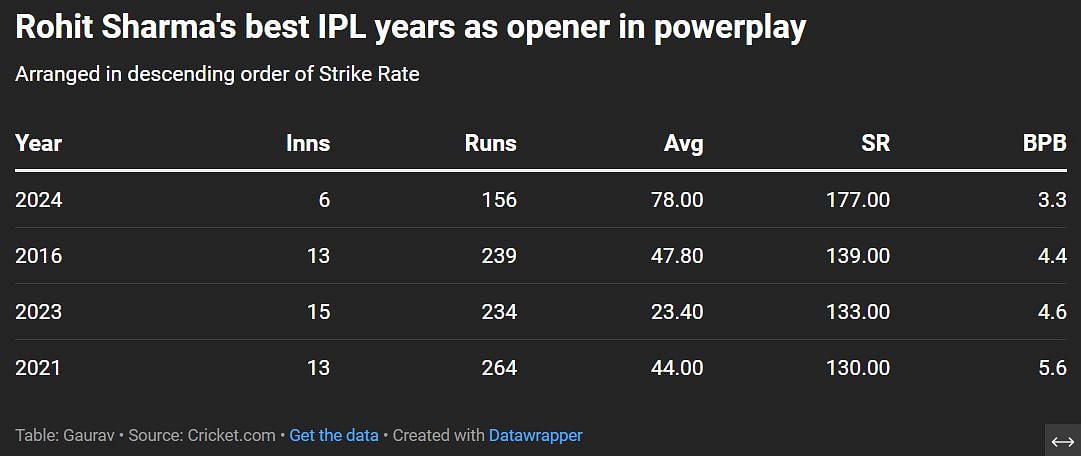 His hundred against CSK encapsulated this much-improved aspect of his batting very aptly, as MI scored 63/0 runs in the powerplay (CSK did only 48/1), with Rohit scoring 45 of those in 25 deliveries with the help of five fours and two maximums.