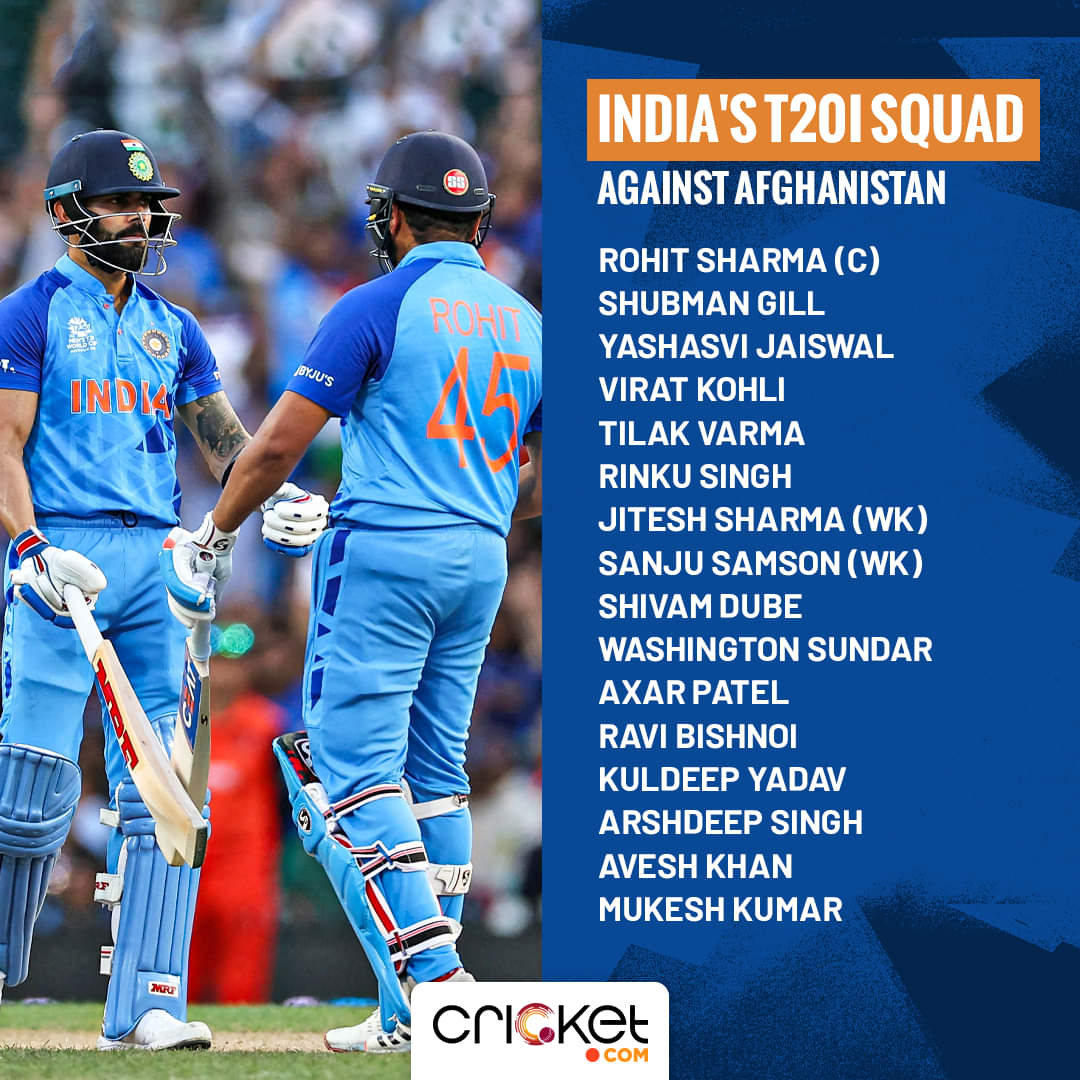 Rohit Sharma (capt), Shubman Gill, Yashasvi Jaiswal, Virat Kohli, Tilak Varma, Rinku Singh, Jitesh Sharma (wk), Sanju Samson (wk), Shivam Dube, Washington Sundar, Axar Patel, Ravi Bishnoi, Kuldeep Yadav, Arshdeep Singh, Avesh Khan, Mukesh Kumar