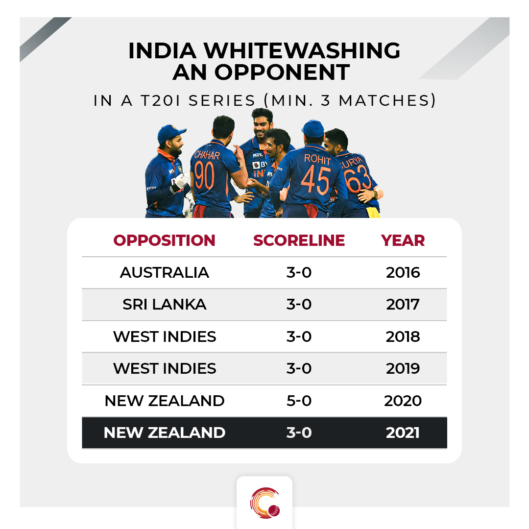 STATS HIGHLIGHTSAfter heartbreak in the recently concluded T20 World Cup, the Indian team bounced back in a commanding fashion to outclass New Zealand 3-0 in the T20I series at home. Under the astute leadership of Rohit Sharma and the able guidance of Rahul Dravid, the team performed exceedingly well and registered their second clean sweep in a bilateral series against the Kiwis. The Men in Blue won 5-0 away from home before the pandemic in 2020.