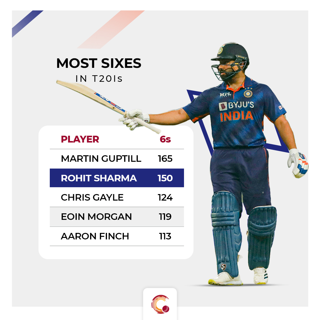 One of the most destructive opening batters in the modern era, Rohit Sharma became the second player to smash 150 sixes in the shortest format of the game. Moreover, Rohit became the first Indian player to achieve this rare feat en route to his three massive sixes in the innings. Martin Guptill is on top of the list with 165 hits over the fence.