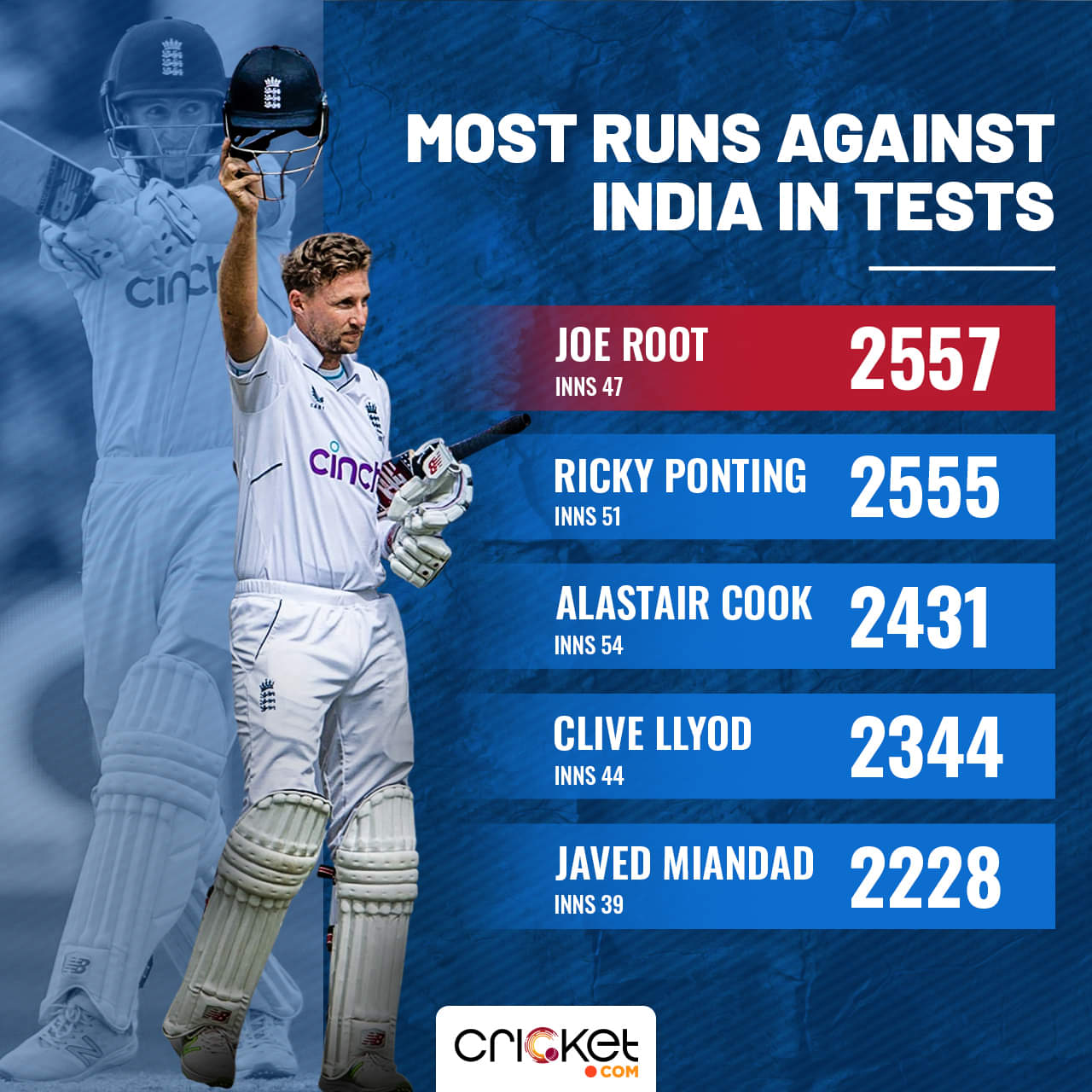 He has the most runs in Tests between the two teams, surpassing Sachin Tendulkar’s 2539 runs. His nine centuries are the joint-most with Steven Smith's against India in Tests. If there is one batter whom England can trust day in and day out when playing against India, you know who.
