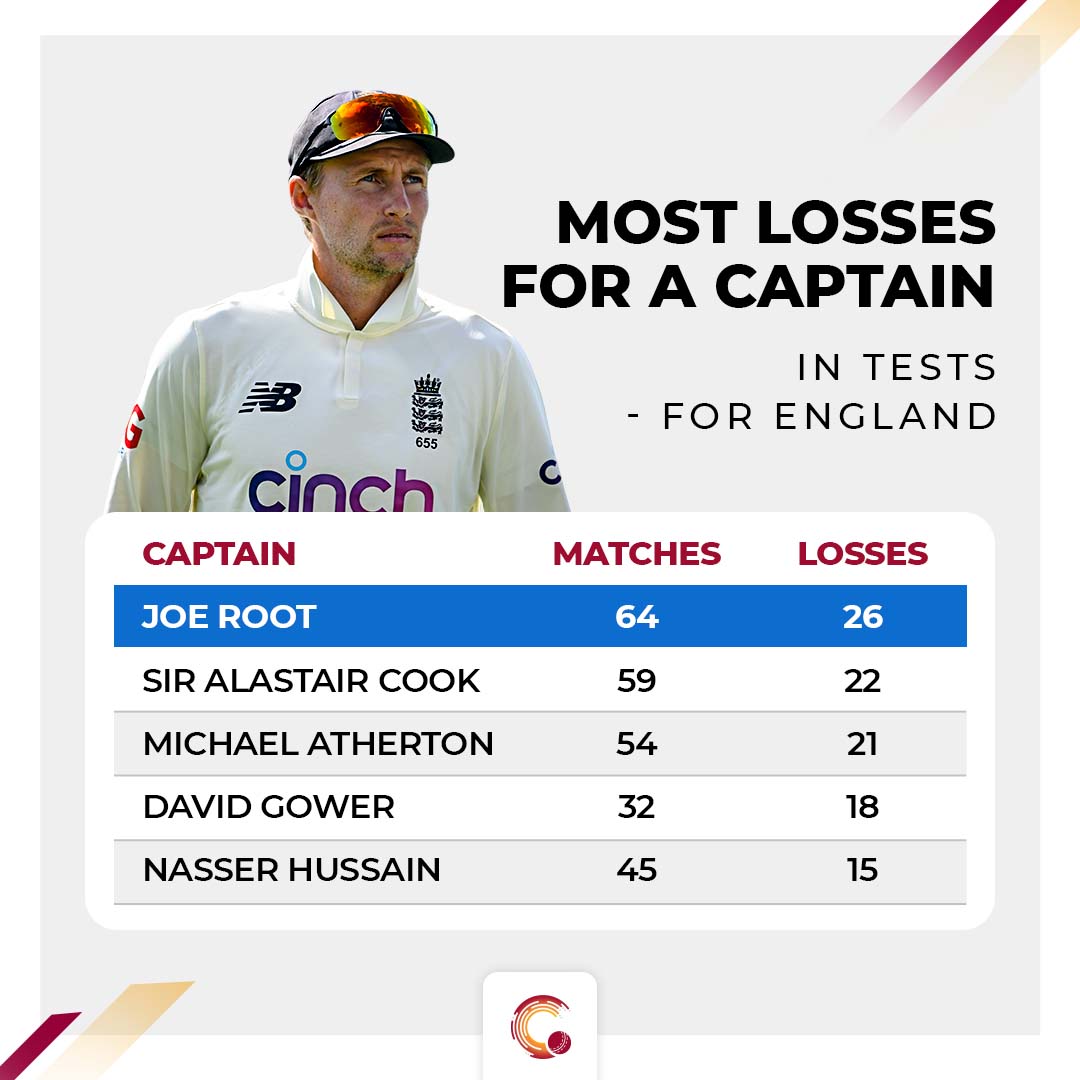 In the 64 matches, Root has a win/loss ratio of 1.038. Despite being the most successful captain in terms of wins, his win/loss ratio is on the lower side because of the number of losses he has suffered. Throughout his captaincy tenure, Root has suffered 26 defeats and only 11 draws. His 26 losses are the most for an England captain.
