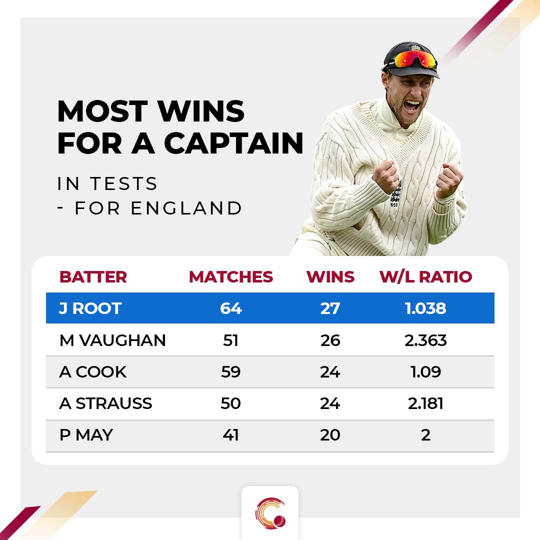 In 64 matches under him, England have won 27 games, which is the most for an England captain. With his win against India in Leeds in 2021, Root surpassed Michael Vaughan’s tally of 26 wins. Out of those 27 wins for Root, 10 of those came in away matches. Making him the only England captain so far to win ten or more away matches.