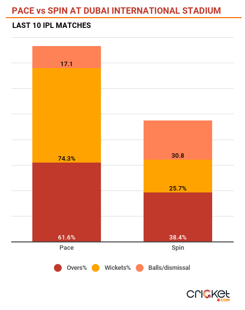 The spinners haven’t had much luck in the last 10 matches, it is even worse in this season. The pacers have bagged 74.3 percent of the wickets as compared to 25.7 by the spinners in the last 10 matches. This reflects in their balls/wicket ratio as well. Pacers have picked up a wicket every 17.1 balls as compared to 30.8 by spinners. This season, the difference is even higher as the pacers have a balls/wicket ratio of 16.3 and spinners have a wicket every 40.6 balls.