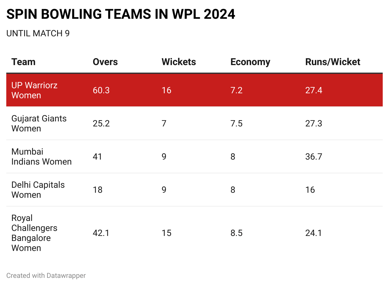 UPW, in their previous game, subverted Gujarat with 19 overs of spin. Overall, in this tournament, Alyssa Healy’s team has bowled 60.3 overs of spin, the most by any team by a distance.