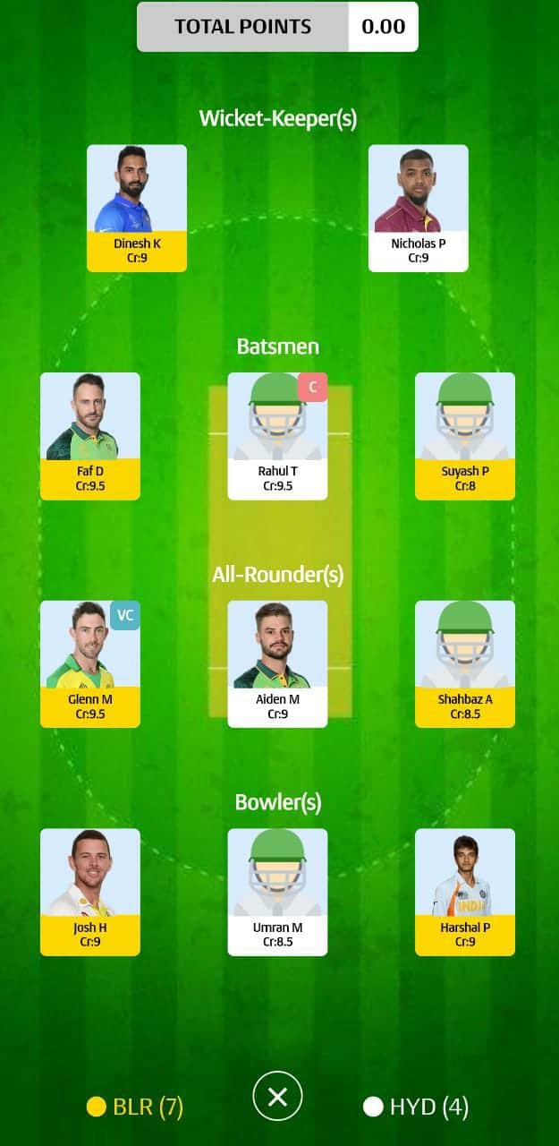 Royal Challengers Bangalore: Faf du Plessis (c), Anuj Rawat, Virat Kohli, Glenn Maxwell, Suyash Prabhudessai, Shahbaz Ahmed, Dinesh Karthik (wk), Wanindu Hasaranga, Harshal Patel, Josh Hazlewood, Mohammed Siraj