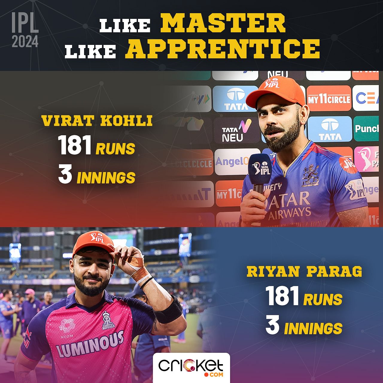 Riyan Parag scored his second fifty in a row and has now made vital contributions in all three games for RR with scores of 43 (29), 84* (45) and today 54* (39). He walked in to bat during a tricky period (RR were 42/2), weathered the storm and raced his team across the finish line with 27 balls to spare. With 181 runs in the season, he now has the Orange Cap, tied with Kohli for most runs in IPL 2024.