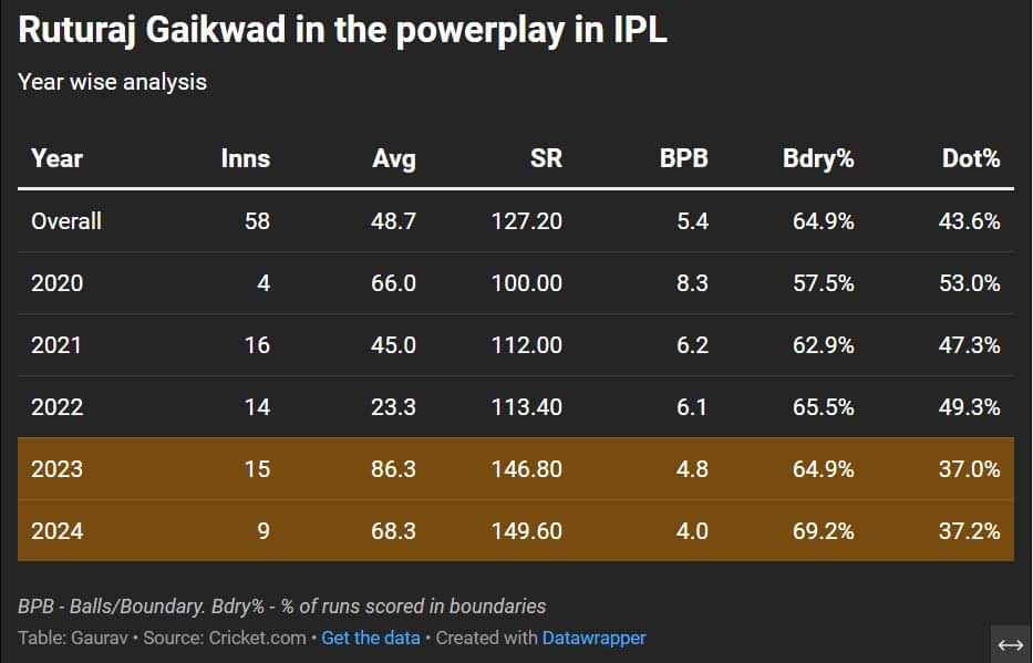 Today, i.e. April 28, against Sunrisers Hyderabad, Gaikwad was 33 (17)* at the end of the powerplay, scoring almost two runs every ball he faced.