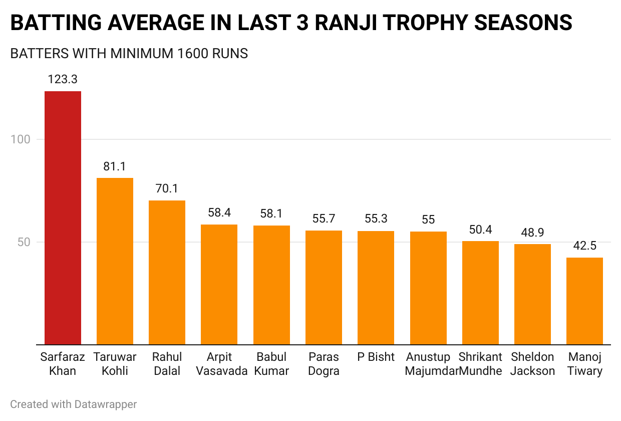 No other batter has scored more runs at a higher average than Sarfaraz. The 26-year-old Mumbai batter has mustered 2,466 runs in the last three Ranji Trophy editions at an average of 123.3. He has 10 hundreds in 27 innings.