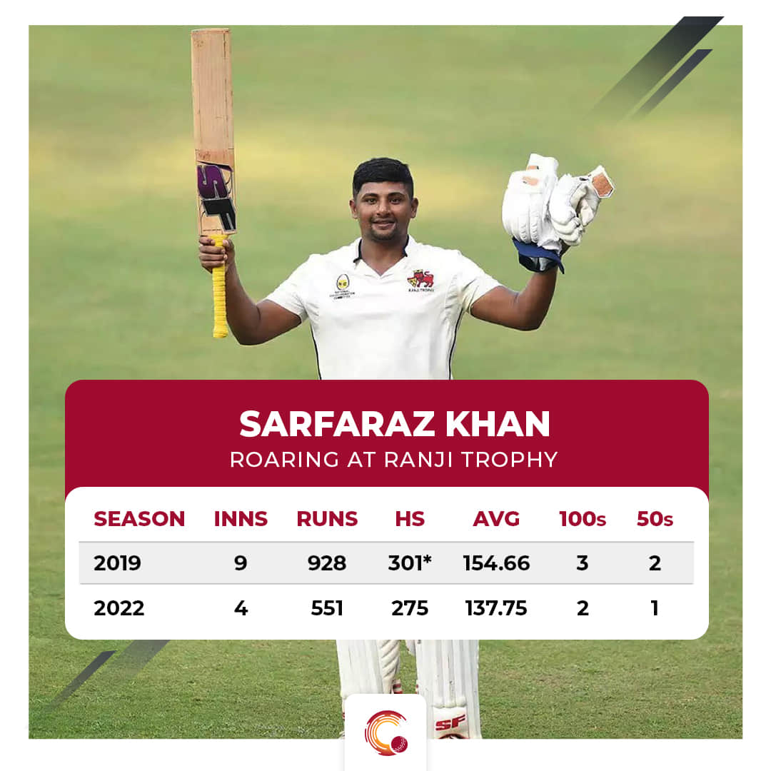 With India's premier domestic competition making a return in 2022, he kicked things off in style with an innings of 275 against Saurashtra, then followed it up with scores of 63 & 48 against Goa. In Mumbai's final fixture against Odisha, Sarfaraz again stepped up with the bat, scoring 165 and helped his team proceed to the next stage with an innings victory. The 24-year old has been leading the run-charts for Mumbai in consecutive seasons now.