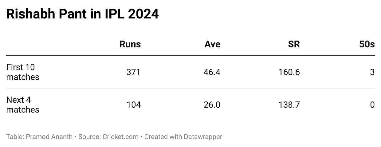 Overall, Pant’s stats this season – 446 runs at a strike rate of 155.40 – does not look all that bad. Even behind the wickets, he has been sharp, be it with his catching or his stumping, which is a massive boost for DC and India. But what could have been an excellent season has now turned out to be an okayish one.