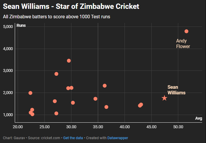And despite all the constraints of a start-stop kind of Test career, he averages 47.43 with the bat. No other Zimbabwe batter in history who has scored more than 1,000 runs in Test cricket, apart from Andy Flower, has averaged higher. In the visualisation of perpetual Zimbabwean batting mediocrity, he shines like a star, with only the mighty Flower blooming above him with an average of 51.54.