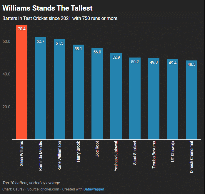Since the COVID pandemic ended and Test cricket returned to relative normalcy, Williams has played nine Test matches. He has scored 985 runs at an average of 70.35 in them, scoring four centuries in the process. If you take a cut-off of 750 runs since 2021, no Test batter in this entire world has averaged more than Williams.