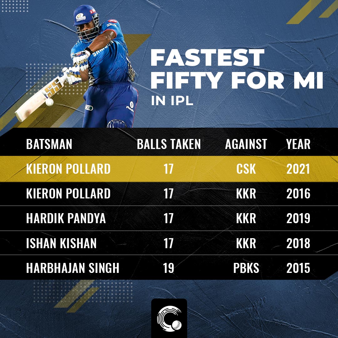 There's something about batsmen from Mumbai Indians and them scoring 17-ball fifties. Pollard, Hardik Pandya and Ishan Kishan have all scored a half-century off 17 deliveries and the former has actually done it twice. Pollard also broke the record of Prithvi Shaw who slammed a fifty off 18 balls against Kolkata Knight Riders earlier this week. Pollard loves playing against Chennai. He has an average of 74.8 and a strike rate of 186.1 in games that Mumbai have won against CSK.