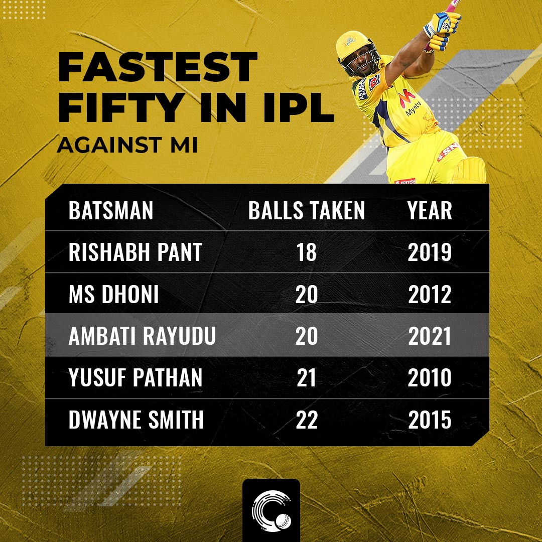 Rayudu finally got an opportunity to make an impression with the bat and the 35-year-old veteran didn't disappoint. The right-hander played one of the best knocks of his career, clobbering four fours and seven sixes in his 27-ball 72*. Rayudu got to his fifty off only 20 deliveries - joint second-fastest for Chennai. Suresh Raina got it off 16 deliveries against Punjab in 2014, while MS Dhoni got it off 20 against Mumbai in 2012.