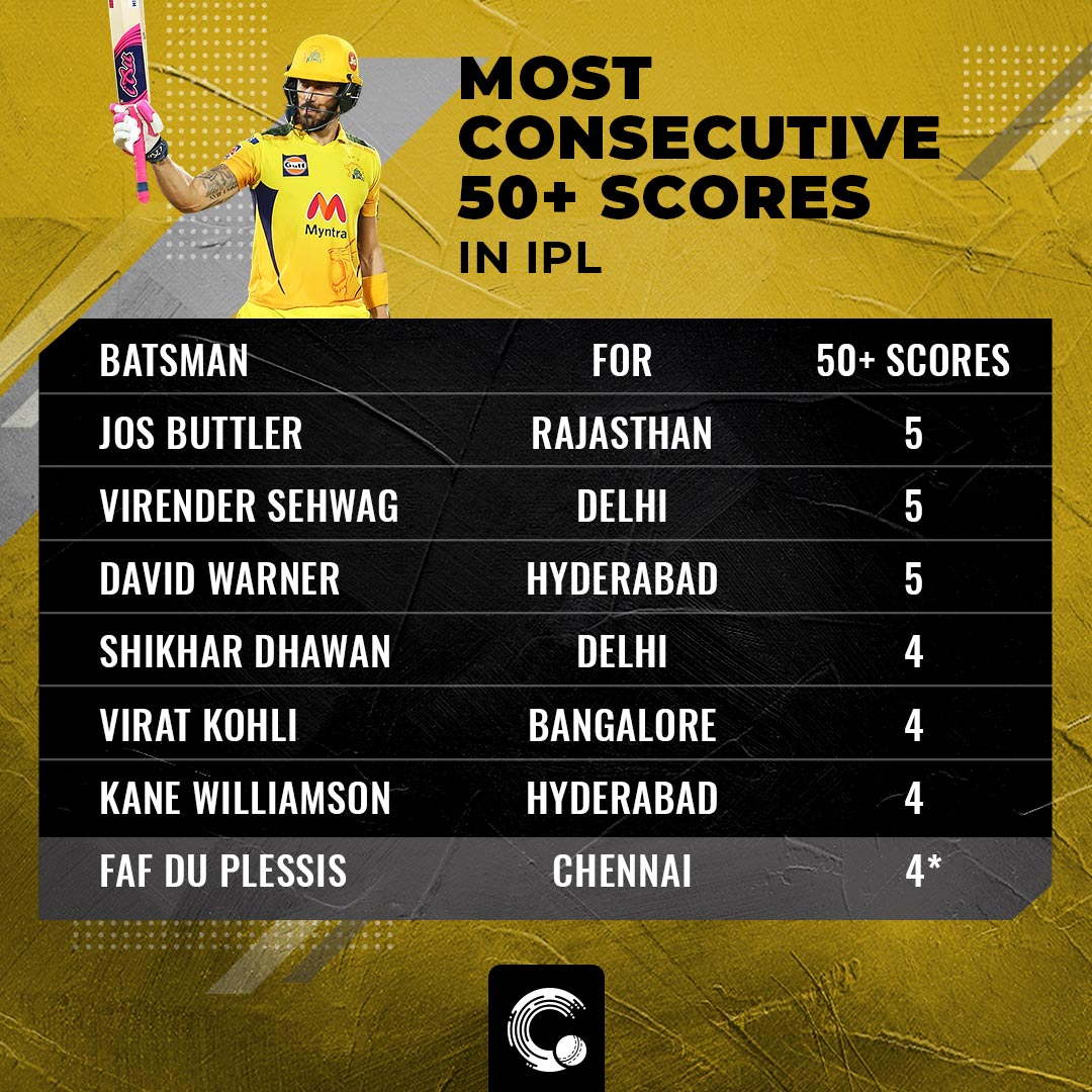 The former South African dropped Pollard in the second innings, but in the first essay, du Plessis continued his rich vein of form with the bat. The right-handed opener became the first CSK player to score four consecutive fifties in IPL. Jos Buttler, Virender Sehwag and David Warner have done it five times, while Shikhar Dhawan and Virat Kohli have scored two centuries and as many fifties on the trot.