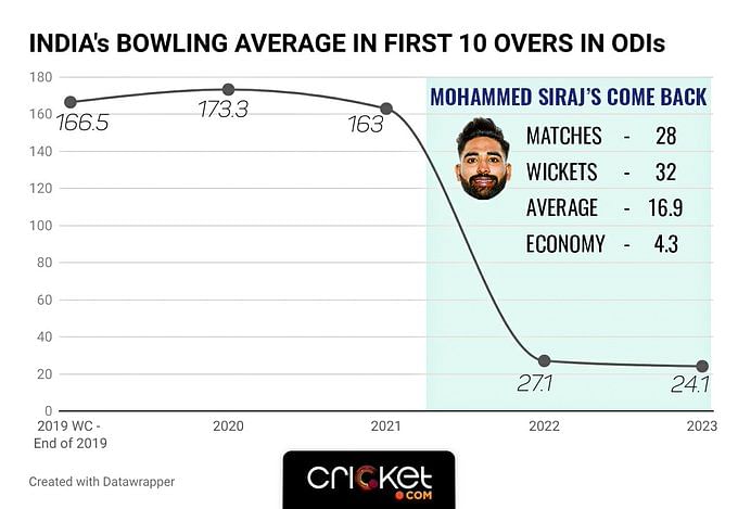 From January 2022 up until the start of the World Cup, Siraj played the joint-most ODIs for India among pacers while picking 54 wickets, 13 more than anyone else. In the absence of Bumrah, he led India’s pace attack. His first ODI in 2022 was the second of his career, after making his debut in 2019. Returning to ODI cricket after three years, he fixed India’s poor numbers with the new ball.