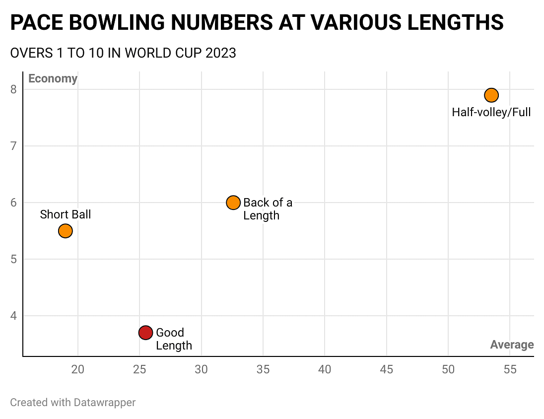 The conditions at the World Cup have turned good length into the best option for the pacers. Both economy and bowling average are far ahead of any other length in the first powerplay.