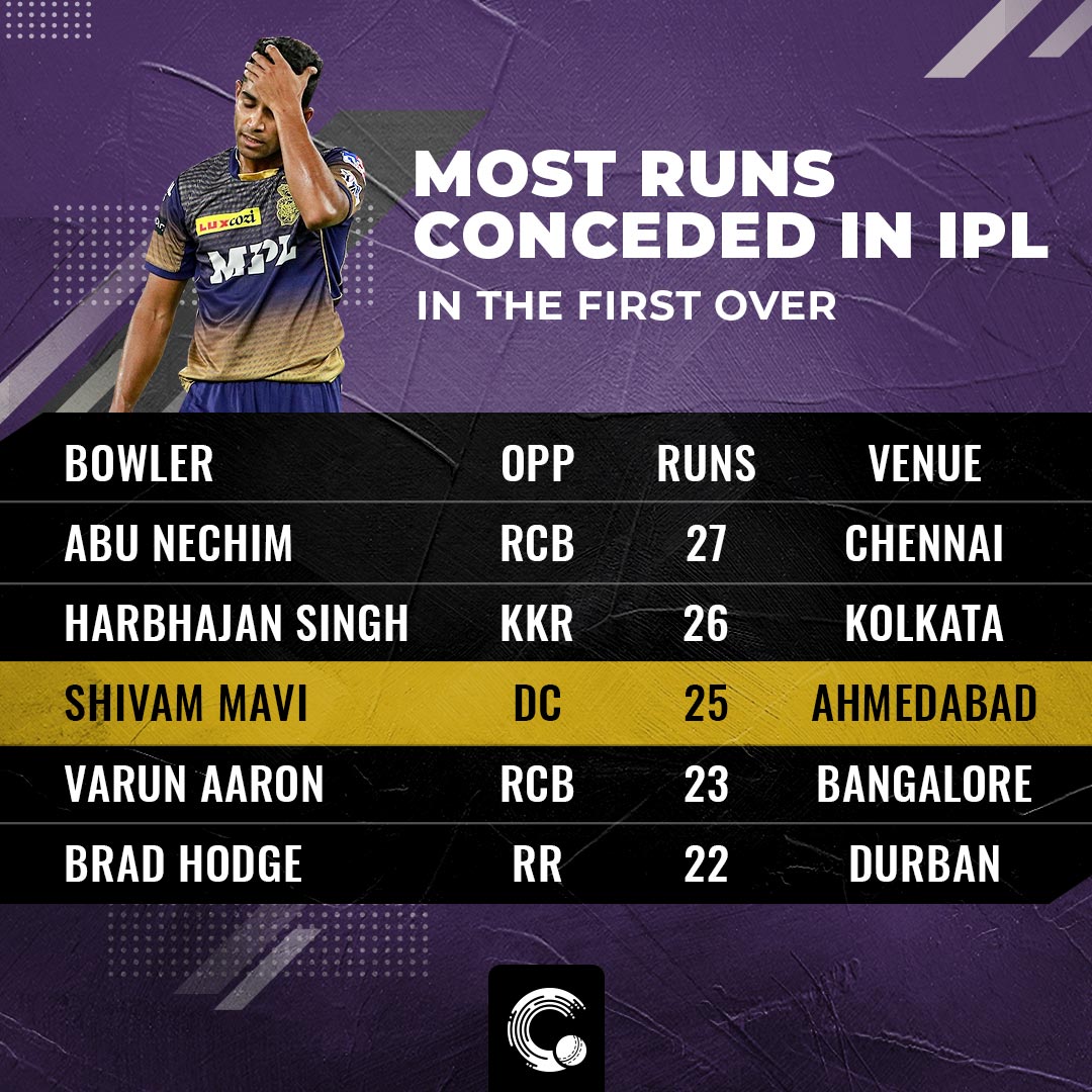 While defending 155, all it requires is a good start from the bowlers. But, for Shivam Mavi, it turned out to be an ephialtes. Starting off with a wayward one down leg, he conceded a boundary of his first legal delivery. Later on, the boundary count didn’t stop till the first over was done. Mavi started off with a 25-run over, the third most a bowler has conceded in the first over of the innings. On the other hand, he became the first bowler to concede six boundaries. In the first over.