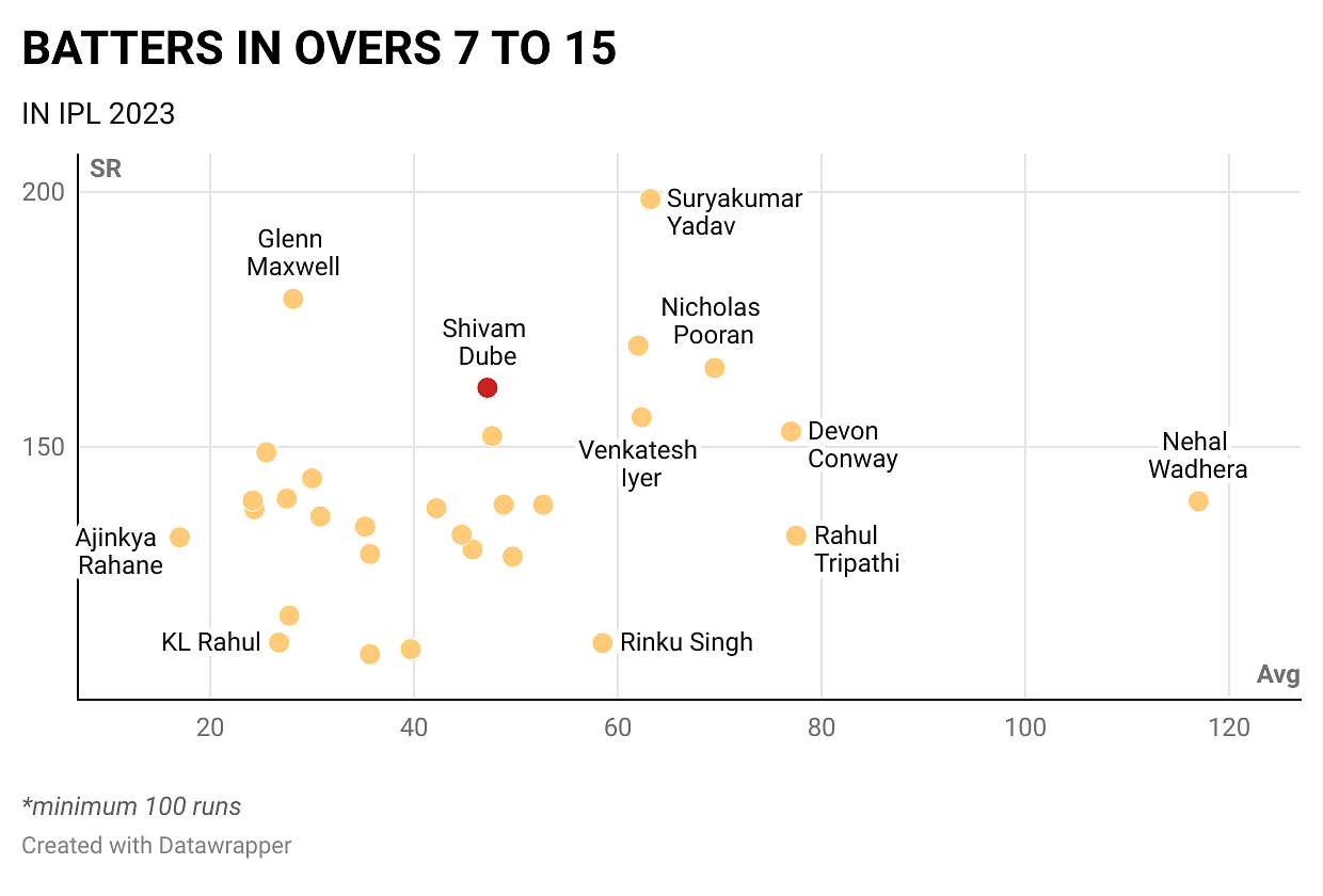 Consequently, CSK have used Dube as a spin-basher in the middle overs. He scored 52 off 27 balls in that match. He has the most runs for CSK in the middle-overs and has the highest strike-rate. He has a high dot-ball percentage but he goes TICK, TICK, BOOOM. He is one of the best middle-overs batters in this tournament.