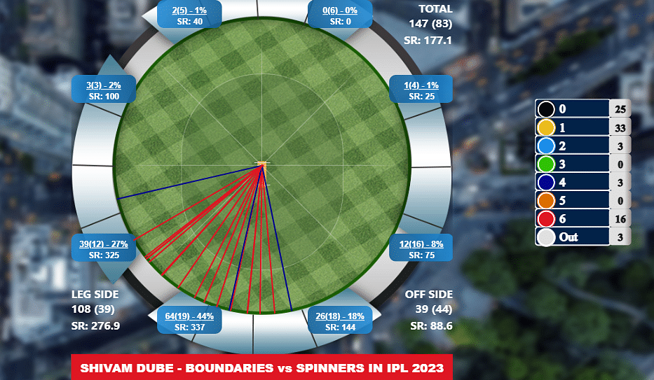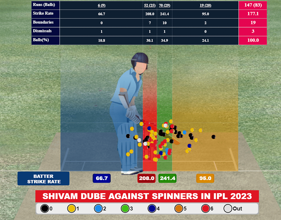 It is vital for the spinners to stay away from his range. As the beehive graphic above shows, Dube’s strike-rate drops significantly when bowled wide outside the off stump.