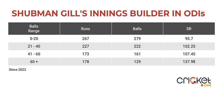In the 15 innings Gill has played thus far since 2022, he has scored at a strike rate of 95.7 in the first 20 deliveries of his innings. In the next set of 20 balls to follow, he has bettered it with 102.25 and 105.45 before launching an attack on the opposition bowlers after facing 60+ deliveries.