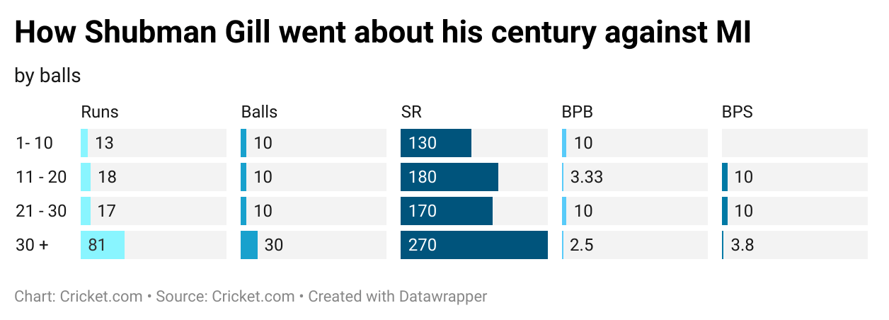 Gill’s issues with run-rate too have been well worth the notice. But this year, there’s been Yashasvi Jaiswal and then Gill, and then the others. In 16 innings this season, the right-handed batter averages 60.79, and if that’s not astonishing enough, he has a strike-rate of 156.4, the second-best for any opener in the league this year.