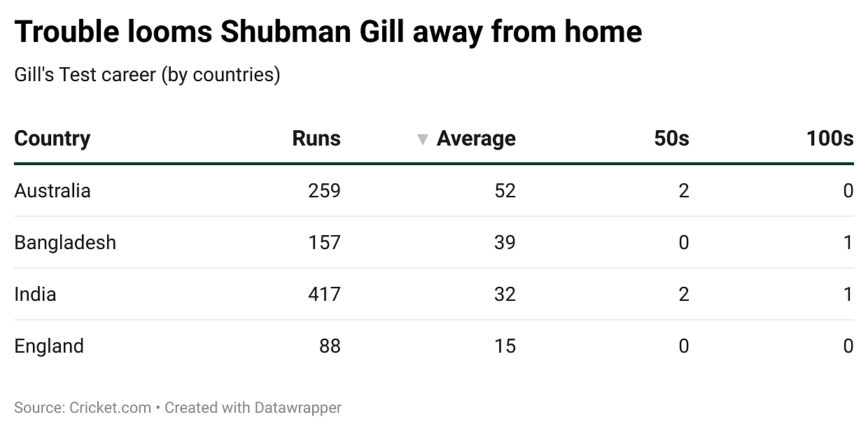 If you dive a bit deeper, in his career, Gill has played 10 Tests in Asian conditions, eight at home, where he averages 33.76. Both his hundreds have come in familiar conditions. While he is nothing short of a beast at home, it is often away from home where his frailties have been exposed multiple times.