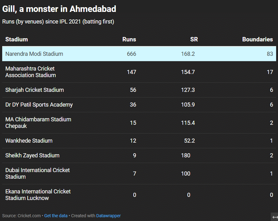 Across the last two years (since 2022) prior to the Punjab contest, Gill had scored 684 runs at the venue, the most for a batter at a single ground. Not just that, his 684 runs, too, came at an impressive strike rate of 161.3.