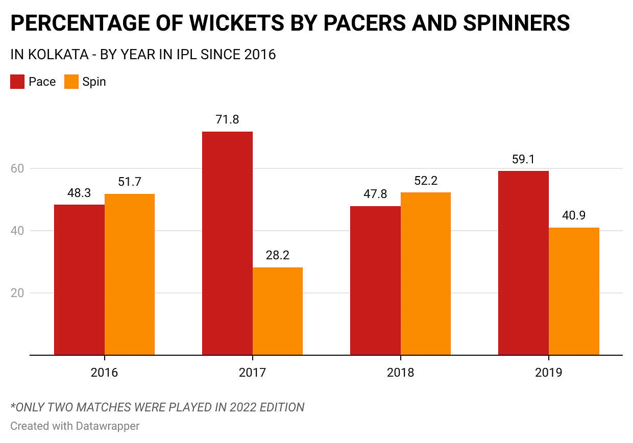 However, the pitch in Kolkata has been unpredictable every following year. One season it would help the spinners and in the other, the pacers. In the 2022 season, pacers bagged 75% of the wickets in the two matches. What will it be, this season?