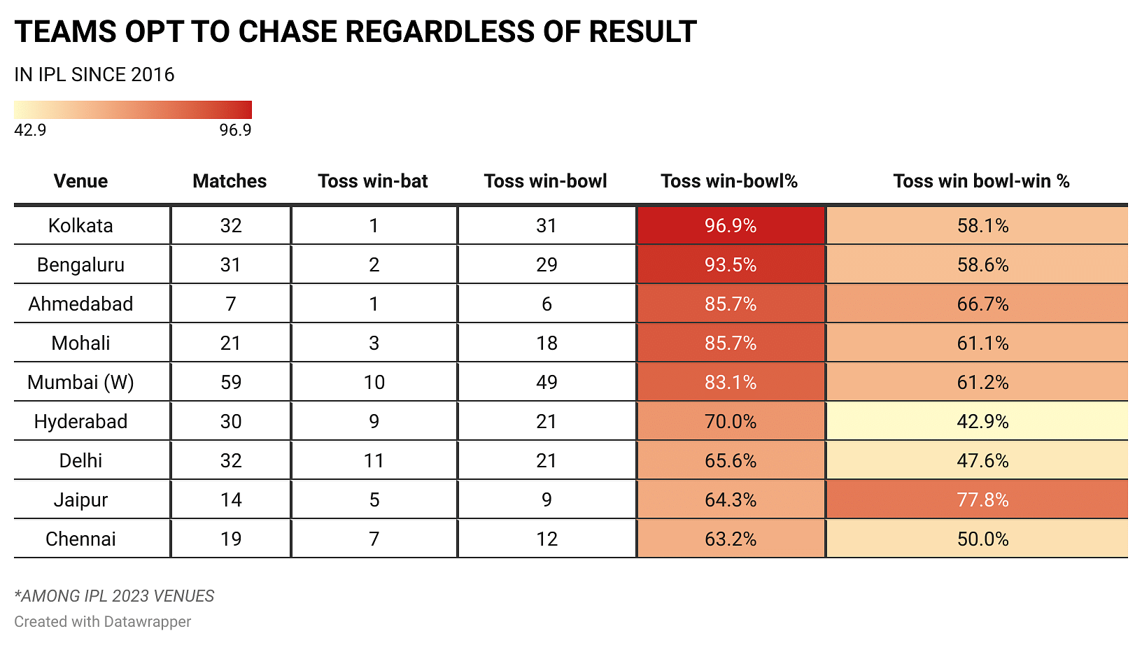 In all the nine venues, teams have opted to field first more than 60% of the time. In Kolkata (96.9%) and Bengaluru (93.5%), the percentage is above 90. In 32 matches in Kolkata, only once has a team chosen to bat first, and only twice out of 31 in Bengaluru.