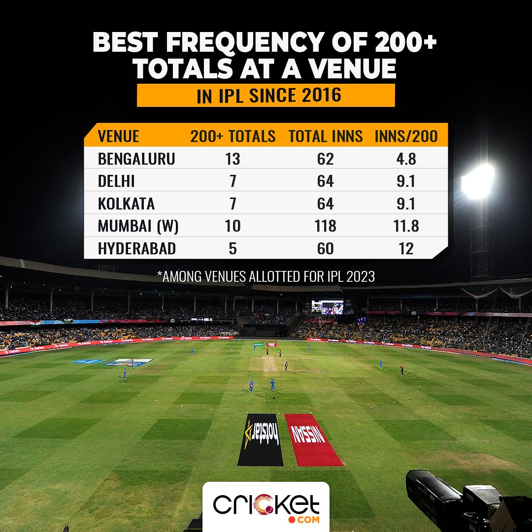 Teams have scored at a run rate of 8.9, the highest among the current venues of the 2023 edition. During this time, the venue has witnessed 13 scores of over 200, which is the most. Wankhede has seen 10 totals of 200+ but in 118 innings. Adding more, a 200+ total has been posted every 4.8 innings in Bengaluru. The next best among the current venues is 9.1 in Delhi.