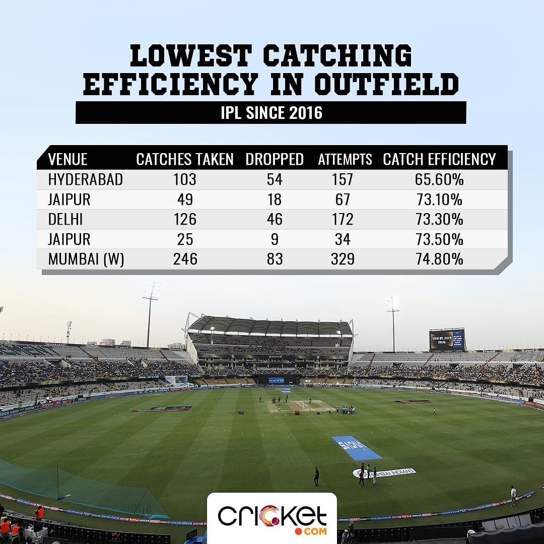 Overall, fielders have had a catching efficiency of 75.4% in Hyderabad, the lowest among all venues. In overall efficiency, there isn't much difference between Hyderabad and Rajasthan (75.6%). However, when it comes to catching outside the 30-yard circle, there is a stark difference.