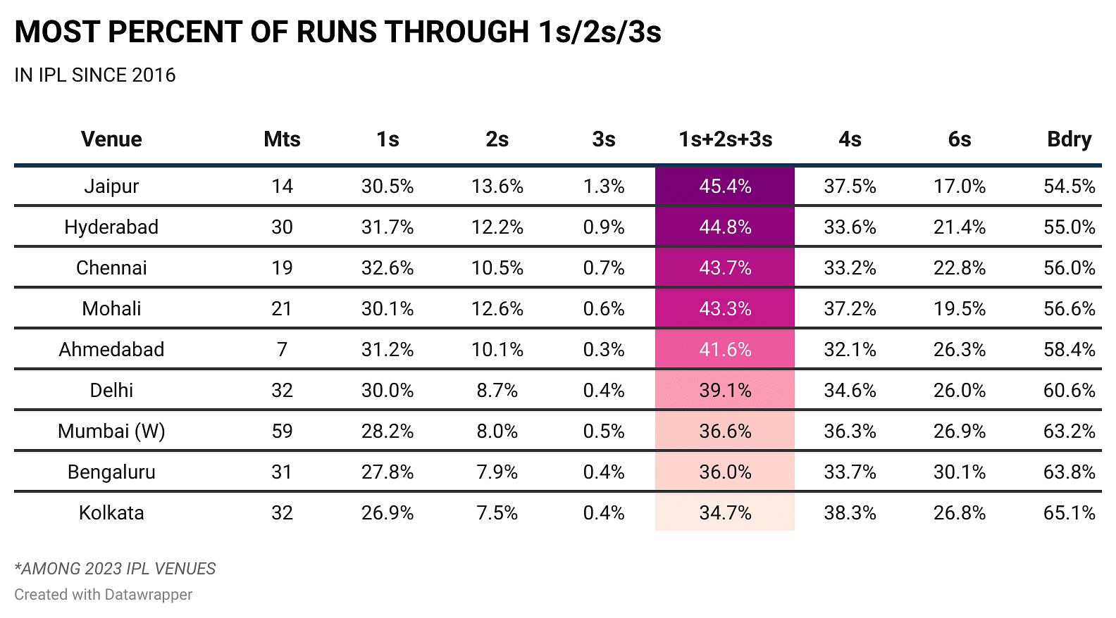 Only 17% of runs have come through sixes, which is the least. But 37.5% of runs have come through fours, the second most after Kolkata. Because of the low percentage of sixes, the overall boundary percentage is on the lower side (54.5%). In fact, the least.