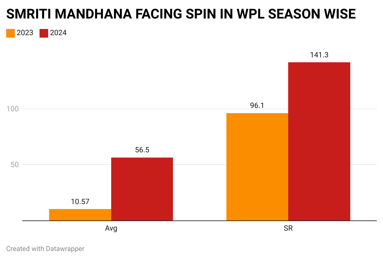 This season, Mandhana has belted spin at 141.3. The same was displayed during her 80 off 50 balls against UP Warriorz on Monday evening (March 4). The knock has come against arguably the best spin-bowling team of the season.