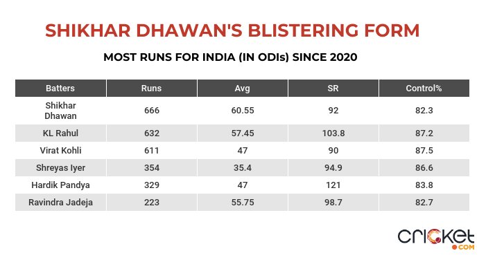 Heading into the 2023 ODI World Cup, there is already a long discussion over Shikhar Dhawan’s place in the lineup. A left-handed opener? One who has multiple gears? One who takes responsibilities? Dhawan ticks all that box and more with his consistency for the national team. Since 2020, in the 50-over format, no Indian player has scored more runs than Dhawan, showing his importance for the Men in Blue.