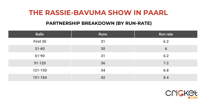 Prior to this clash, the pair had one century-run partnership in between them. Rassie, in particular, showed excellent control, with 70% control in the first 40 balls. Post that, he went ballistic. In the 56 deliveries post that, he scored at a strike-rate of 154.44, and had a false-shot percentage of 5.25.