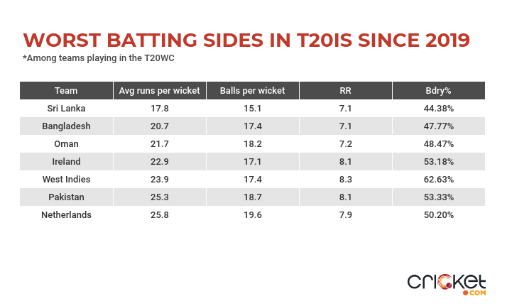 Since 2019, among teams who will be participating in the upcoming T20 World Cup, only Sri Lanka have averaged lower than Bangladesh’s 20.7. The Dasun Shanaka-led team is also the only side to have batted as slow as Bangladesh (RR 7.1) in this time-frame.