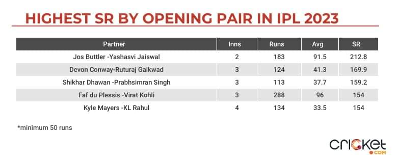 The opening combination of Jos Buttler and Yashasvi Jaiswal have been the standout performers for the Royals in their two wins this season. The duo have smashed 183 runs in two innings at an average of 91.5 and a strike rate of 212.8, the highest by a pair for the first wicket with a minimum of 50 runs.