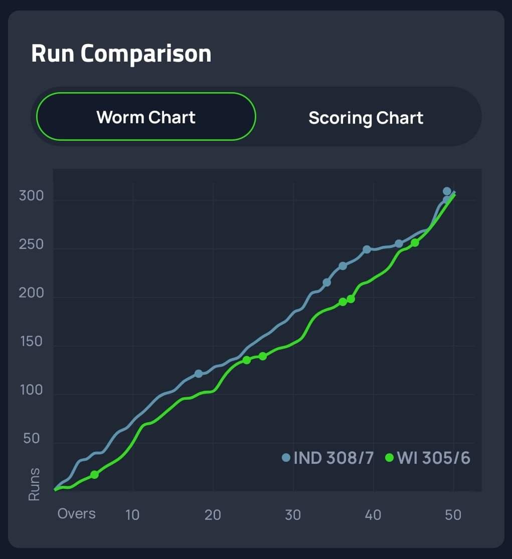 Shikhar Dhawan and Shubman Gill set the perfect platform for a mammoth total, adding 119 runs for the first wicket. However, post Dhawan’s dismissal in the 34th over, India could manage only 98 runs off as many balls for the loss of five wickets. West Indies, on the contrary, smashed 86 runs off their last 10 overs, losing only one wicket. The graph below affirms that more than West Indies accelerating at the death, it was the Indian batters who slowed down.