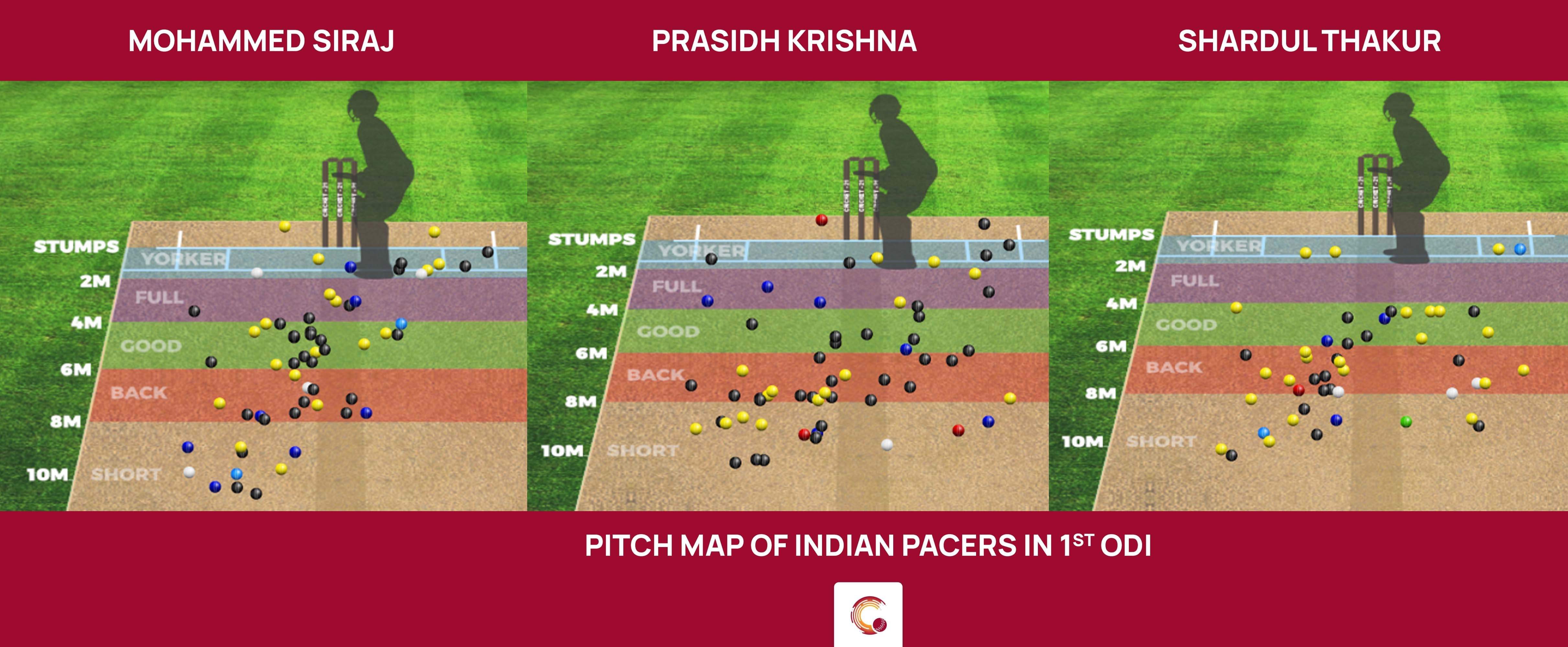 The difference in the rhythm of the three bowlers is clearly visible in the pitch map above. Only Siraj was able to hold his line and length. Thakur was a bit haywire in comparison and Krishna splattered the ball all over the pitch.