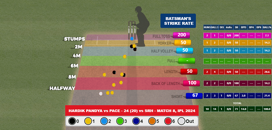 Coming out to bat at five, Hardik Pandya scored only 24 off 20 balls. His strike rate of 120 was the lowest for any batter on both sides with a minimum of 15 balls. Against pace, he managed only 10 off 14 balls. Nine of these deliveries were in the back-of-a-length and short ball region which has been one of Hardik’s weaknesses with the bat while facing pace.