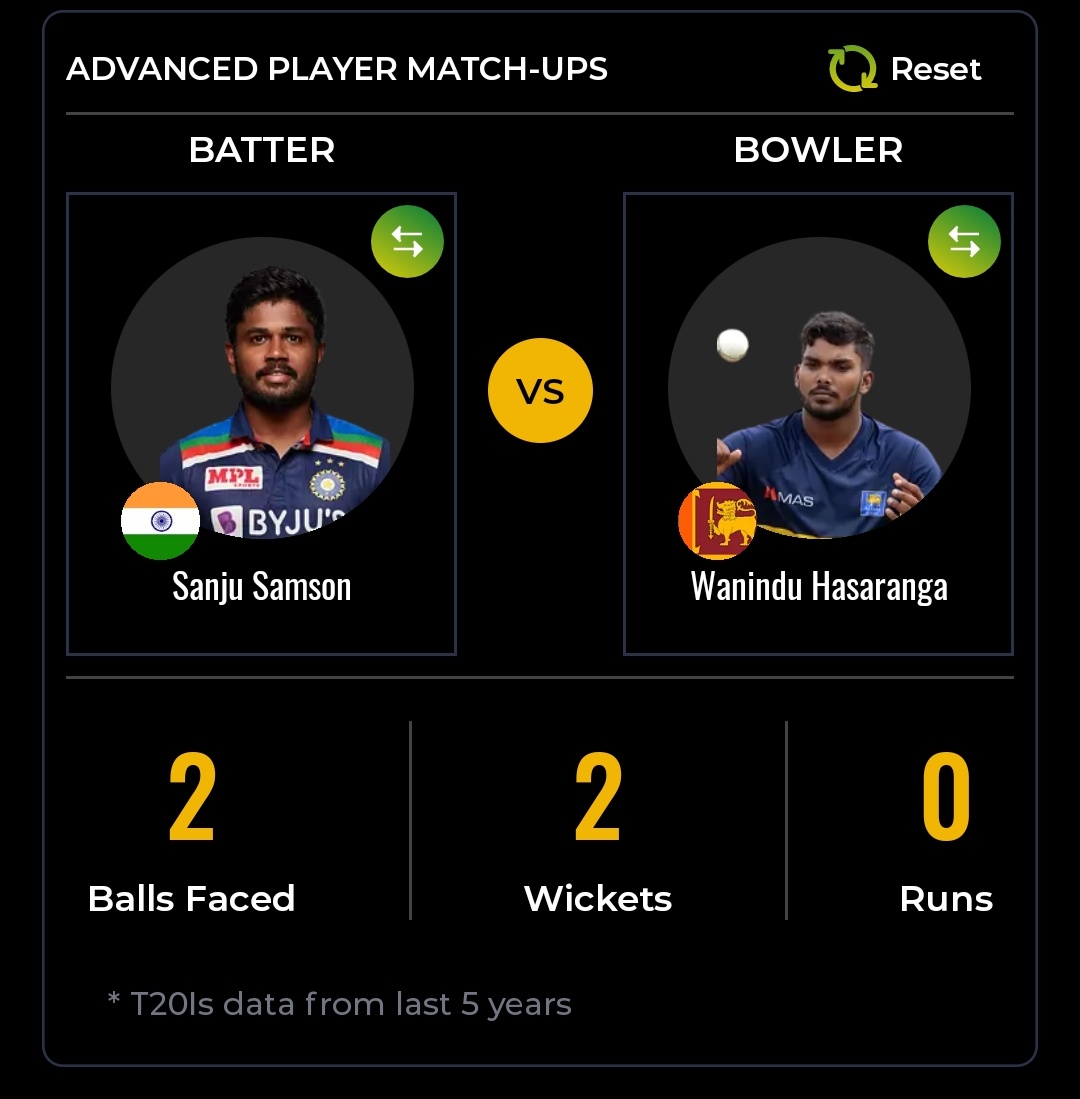 Well, this is an odd match-up, isn’t it? Sanju Samson has faced Wanindu Hasaranga twice in T20Is and on both occasions, it took the leg-spinner only a delivery to get rid of the right-hander. The mode of dismissal has also been the same. Samson has failed to pick Hasaranga’s googly to be caught plumb in front of the stumps. It would be interesting to see if Hasaranga can make it three in three in the second T20I.