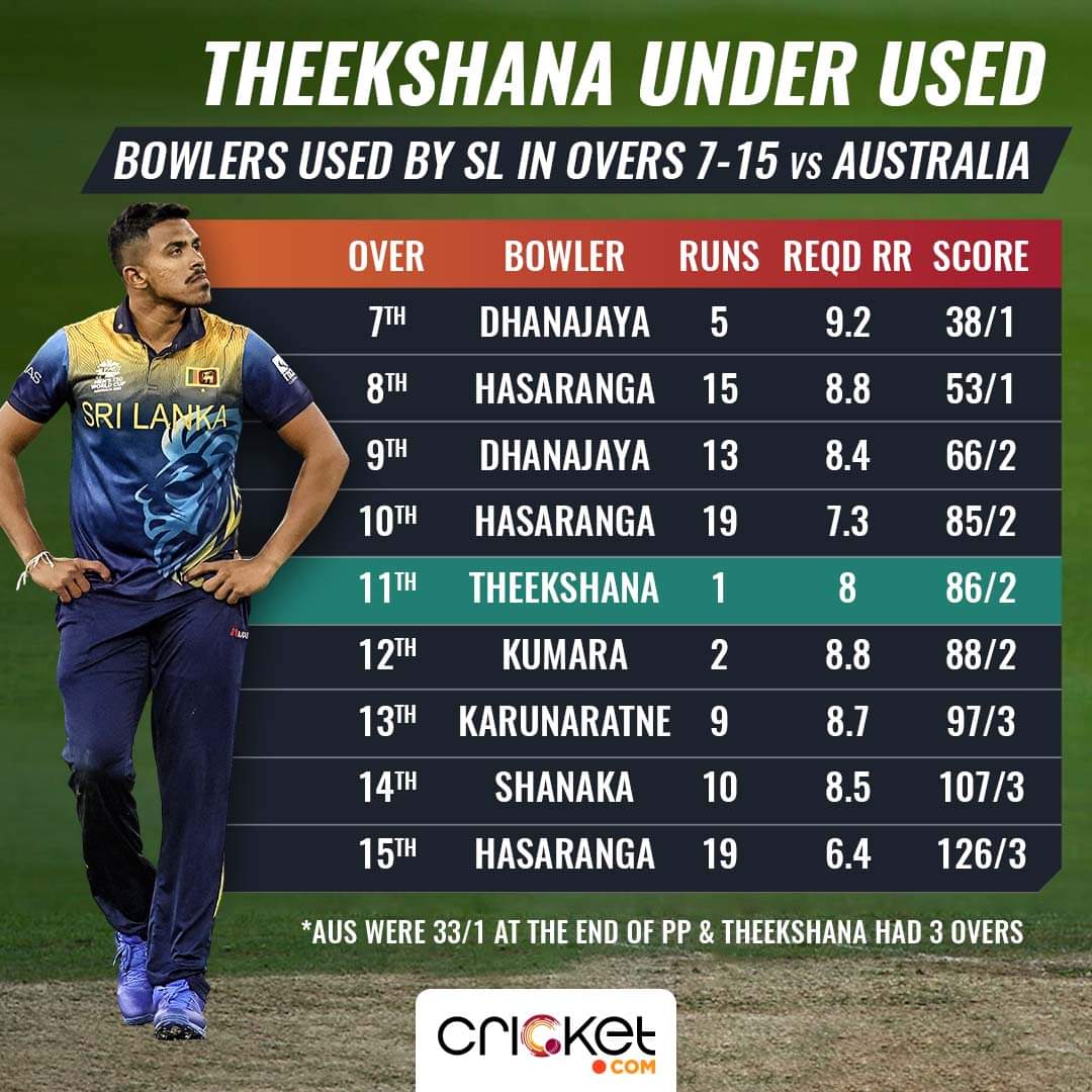 Against Australia, Theekshana bowled just one over in the powerplay and bagged the priced wicket of David Warner, conceding only two runs. He did his part in the powerplay and thanks to that, Australia were 33/1 at the end of six overs.