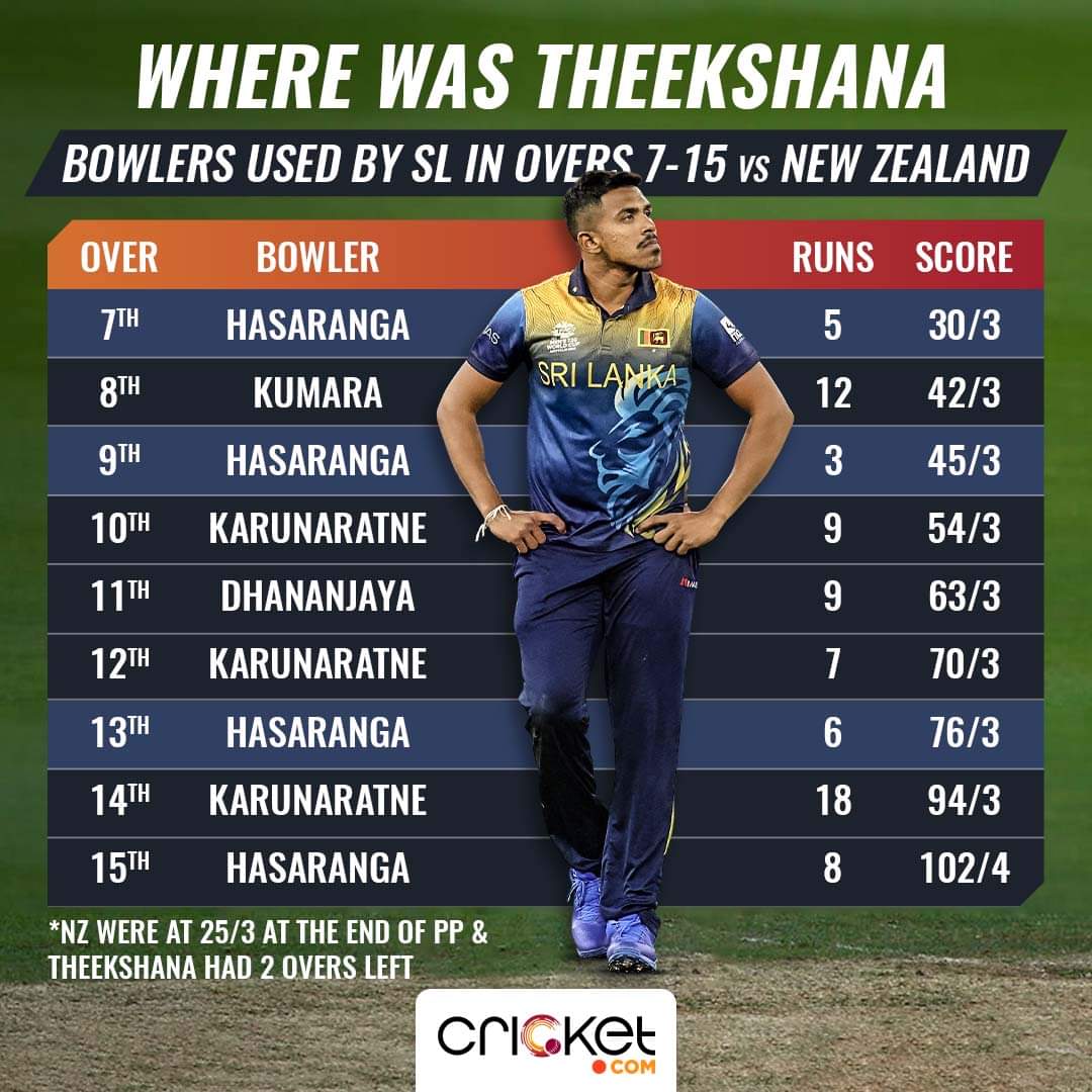Theekshana has been underwhelming in matches where he was required to step up. Consequently, it cost Sri Lanka two matches. More than these two performing together, what has been more baffling is the usage of Theekshana, especially against Australia and New Zealand.