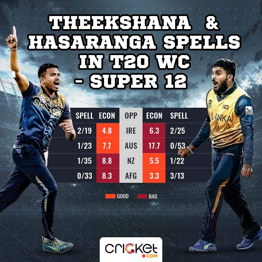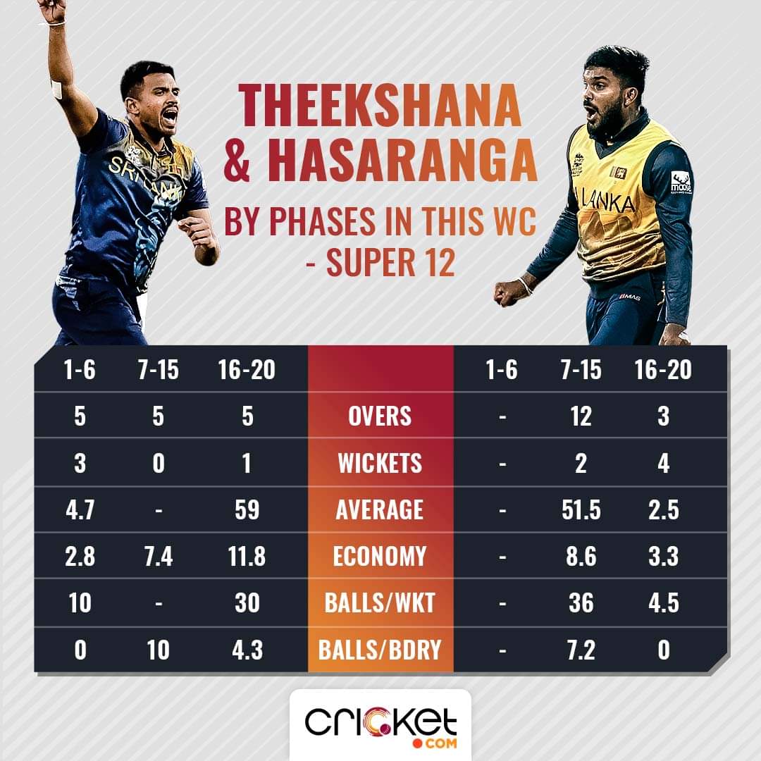Irrespective of their results in this World Cup, especially since the start of the super 12 stage, the two haven’t fired together. Their individual numbers suggest a different story. Hasaranga has picked up six wickets at an economy of 7.5 and Theekshana has four at an economy of 7.3 in the Super 12 stage.