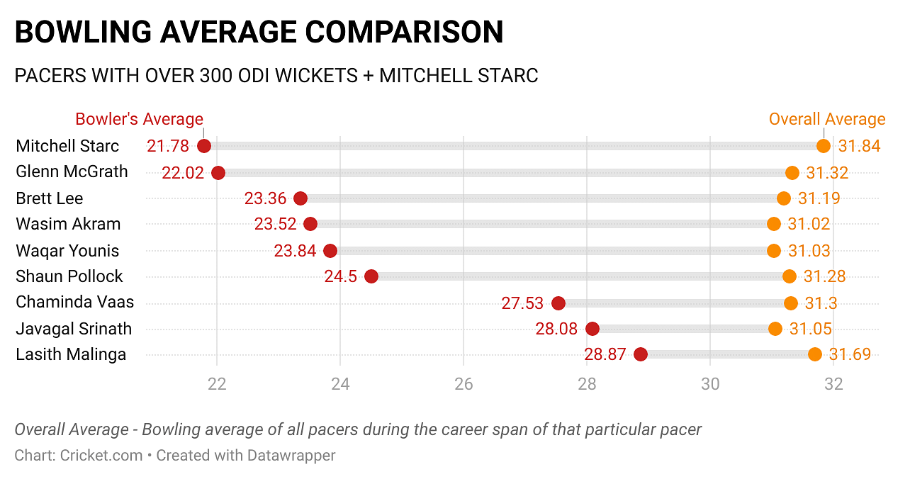 There is a 'starc' difference there, with the left-arm seamer 10.06 runs per wicket ahead of the overall average during his era. The similar numbers for his contemporaries are - Trent Boult - 7.85, Jasprit Bumrah - 7.45, Shaheen Shah Afridi - 7.25, Mohammad Shami - 6.07 and Kagiso Rabada - 4.14.