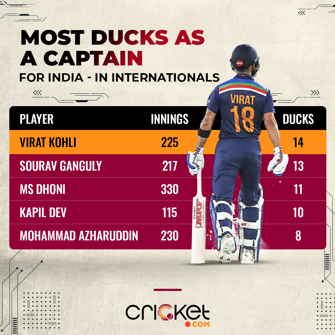 Kohli has had numerous records as captain and as a batsman for India, all memorable ones. But the record he registered in this match is one of the unusual or rather unwanted record that he would like to forget. Kohli registered his 14th international duck as a captain of India, the most among all skippers.